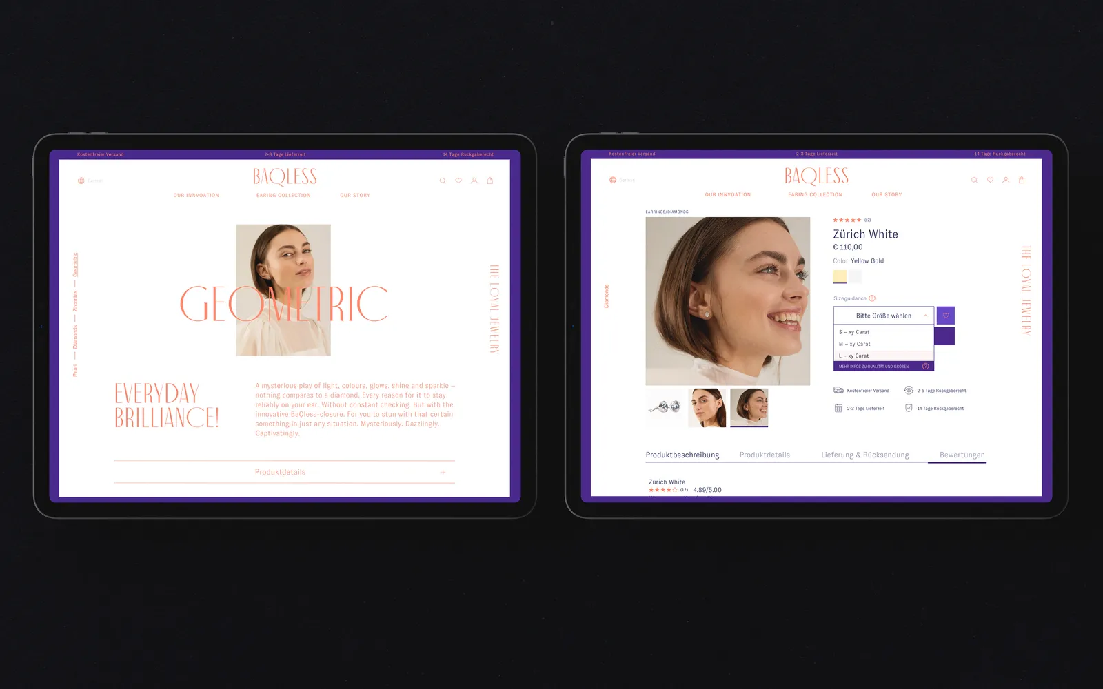 Ohrstecker, die man nicht verlieren kann, da Schmuck und Verschluss in einem Teil gefertigt sind. Für die patentierte Produktinnovation aus der Schweiz gestaltete ontu den passenden Markenauftritt. Baqless ist jung, feminin und selbstbewusst.