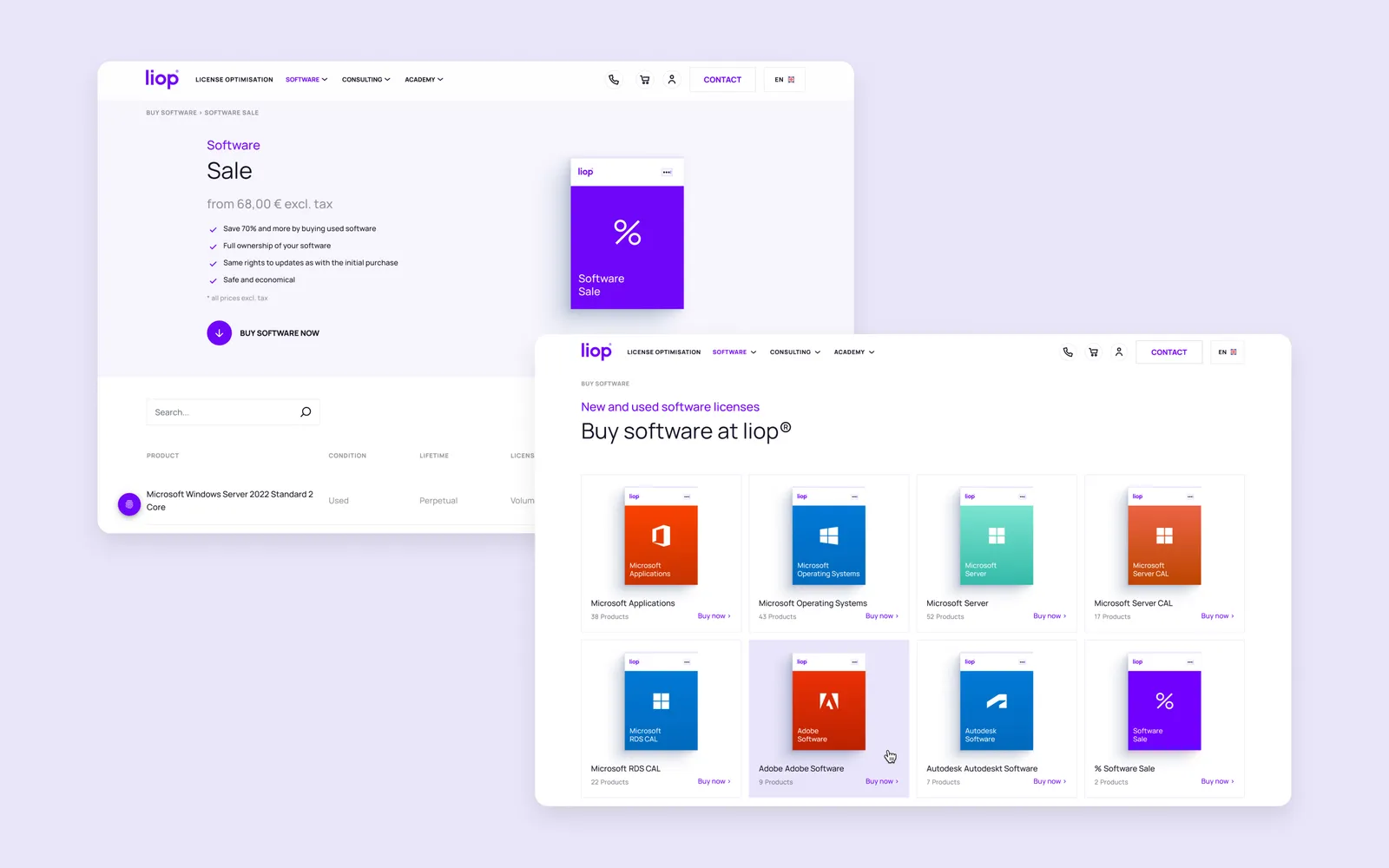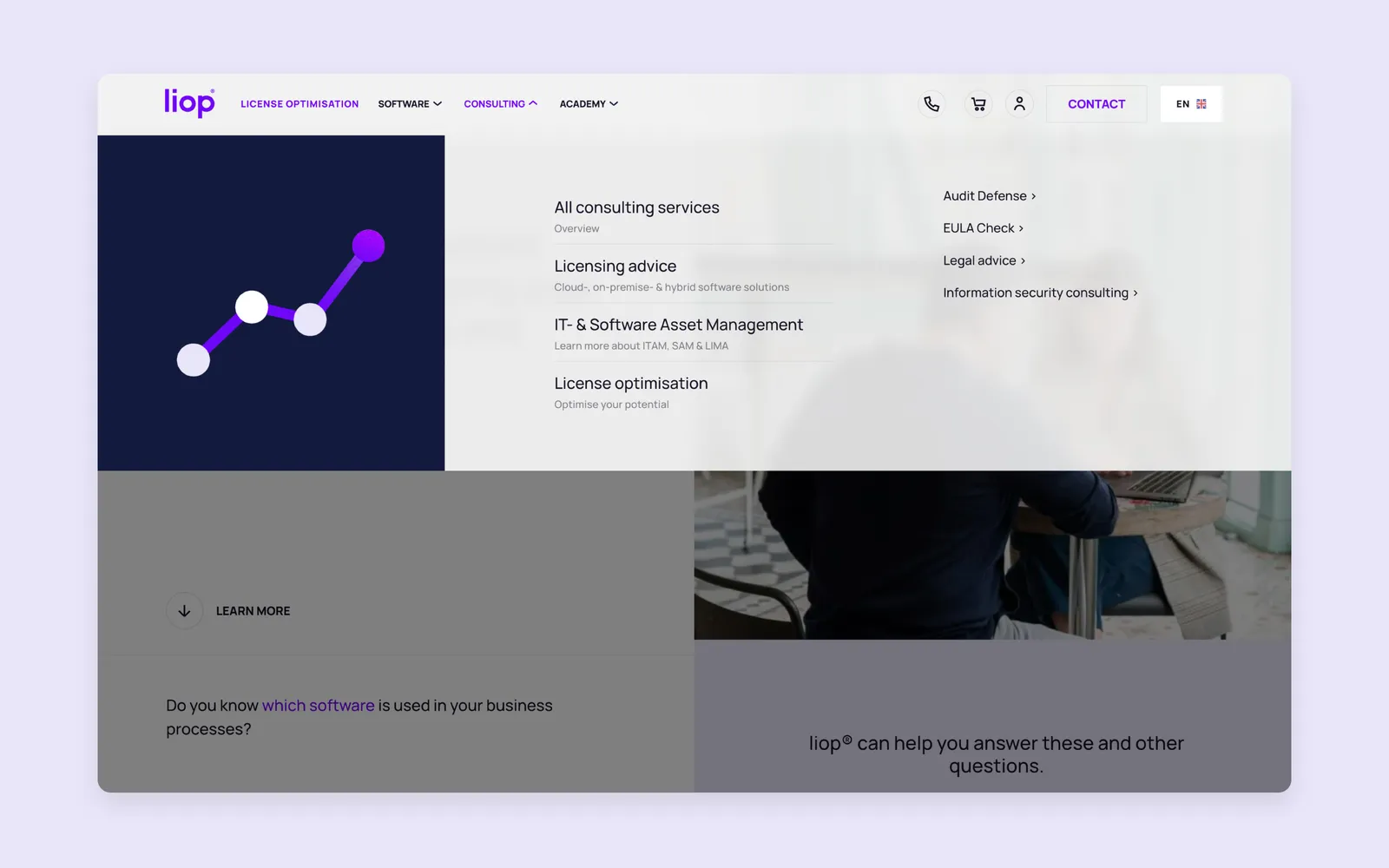 Softwarelizenzierung kann für Unternehmen erheblichen Aufwand bedeuten. Je nach Dimension ist der Prozess meist mühsam und langwierig. liop hilft Firmen dabei, maßgeschneiderte Lizenzlösungen für ihre Situation zu finden und bietet zahlreiche weitere Leistungen auf dem Gebiet der Lizenzierung an. ontu wurde beauftragt, eine neue Website mit integriertem Shop für das Unternehmen zu gestalten.
