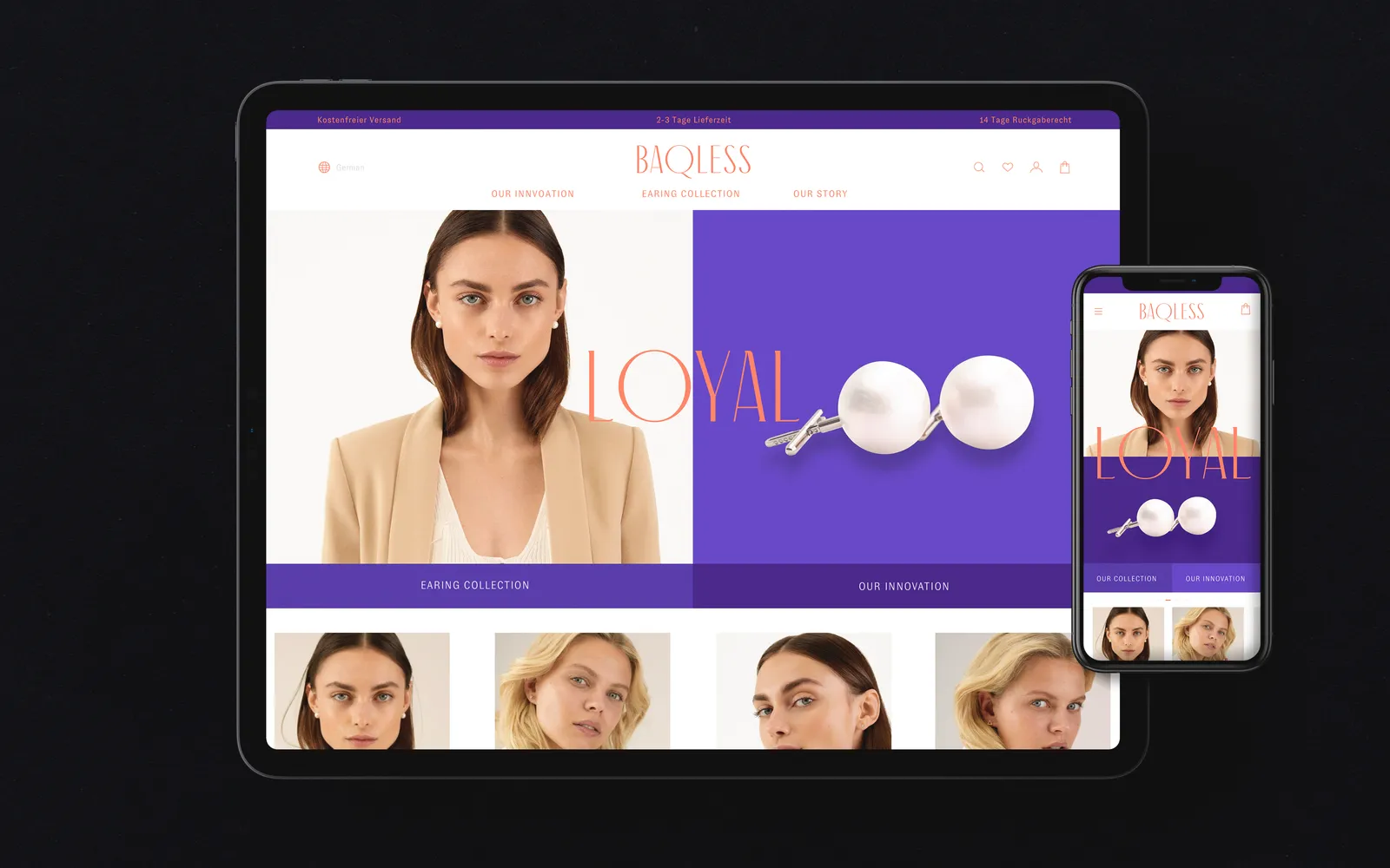 Ohrstecker, die man nicht verlieren kann, da Schmuck und Verschluss in einem Teil gefertigt sind. Für die patentierte Produktinnovation aus der Schweiz gestaltete ontu den passenden Markenauftritt. Baqless ist jung, feminin und selbstbewusst.