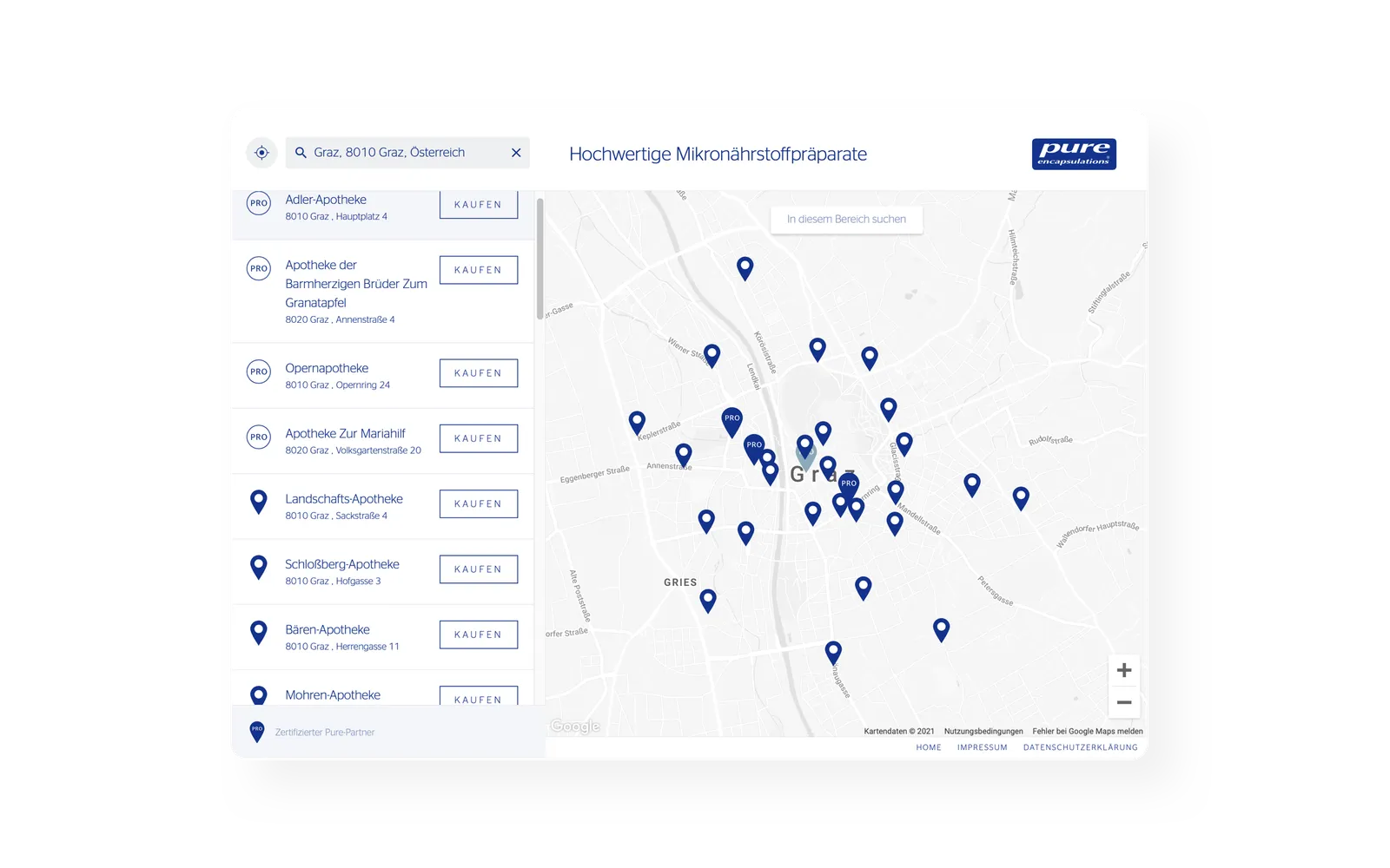 Pure Encapsulations vertreibt europaweit hochwertige Mikro­nährstoffe. ontu entwickelte mit dem Apofinder eine Möglichkeit für Kunden, den schnellsten Weg zu ihren PURE Produkten zu finden.
