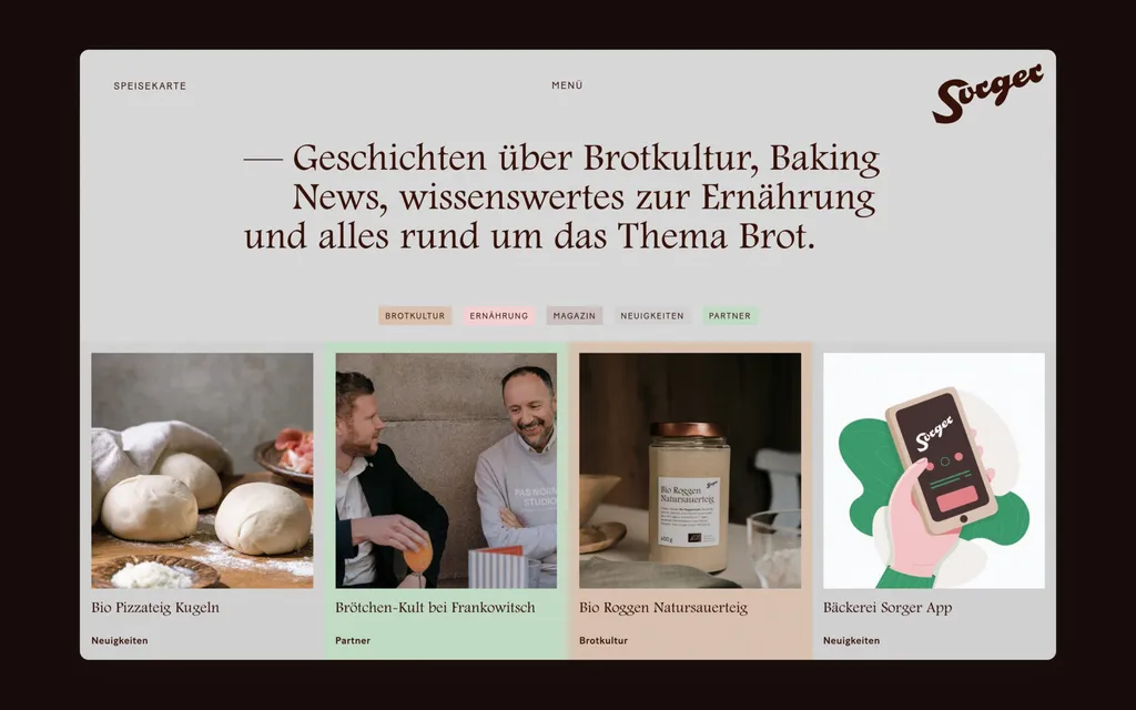 Für die Bäckerei Sorger entwickelte ontu einen Webauftritt, der sich Zeit nimmt. Zeit für die Erzählung, die Werte und die Herkunft der Traditionsmarke. Mit dem digitalen Mittagsmenü und der Vorbestellungsfunktion erweitert ontu die Website und positioniert Sorger zukunftsfähig im digitalen Raum.
